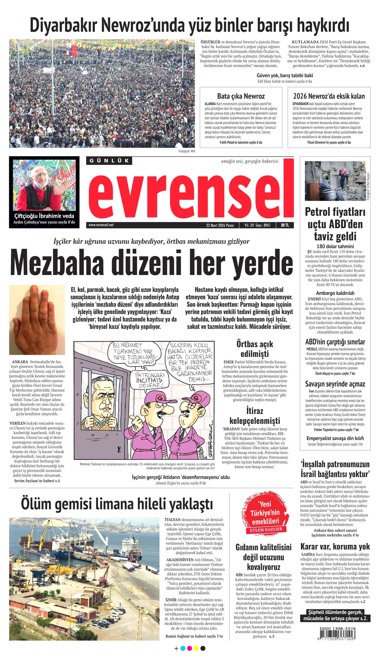 EVRENSEL Gazetesi 22 Mart 2026, Pazar Günü Manşeti